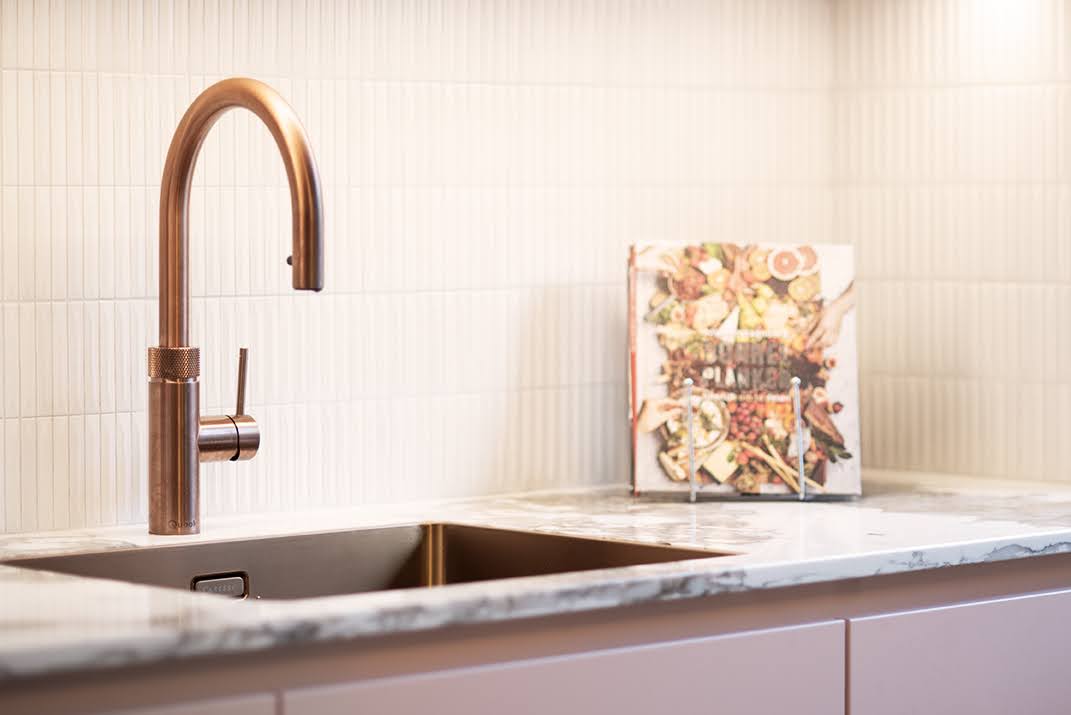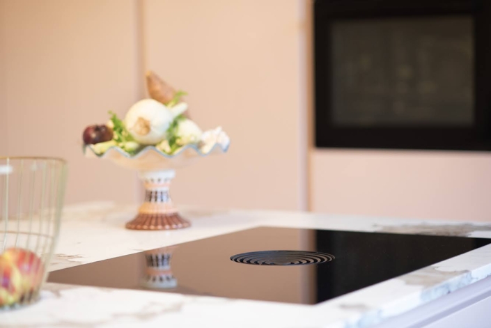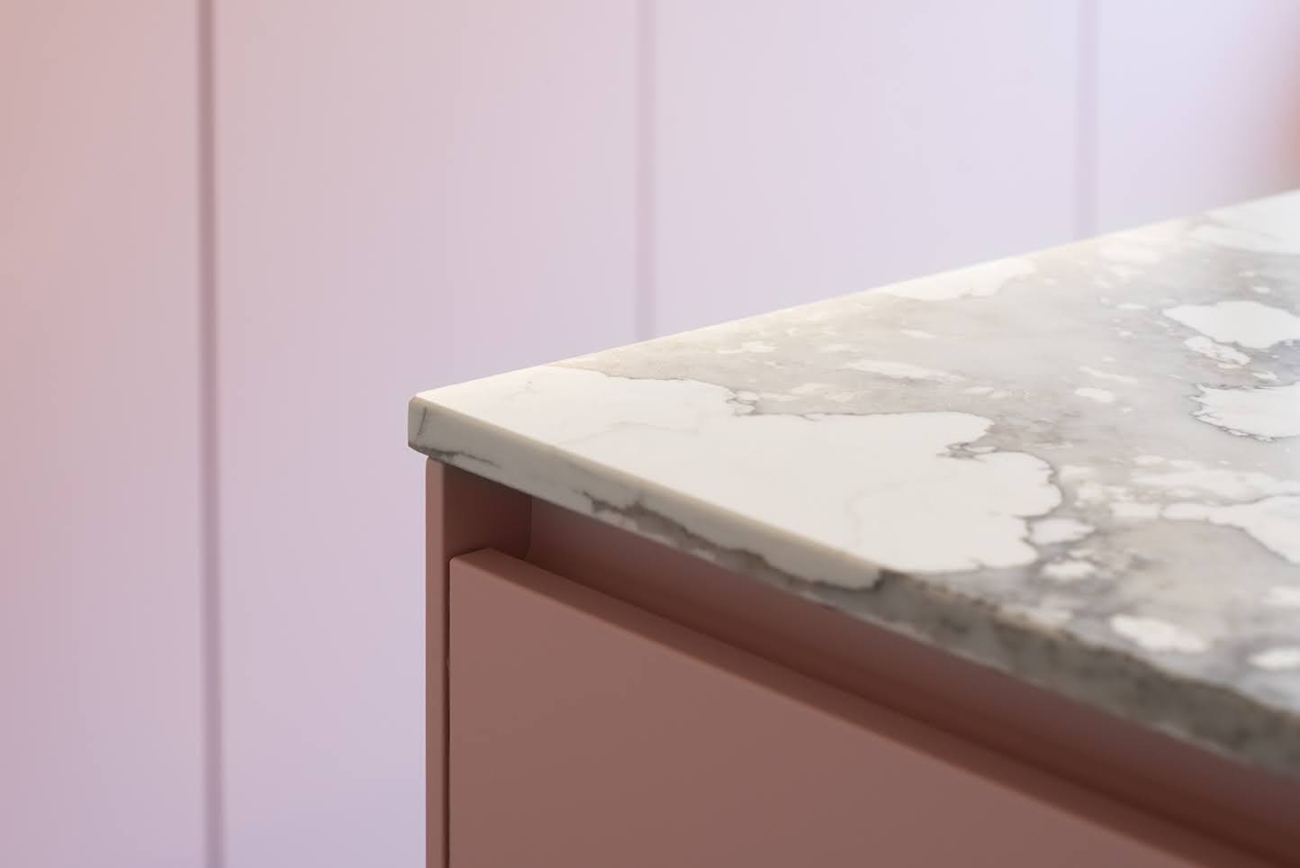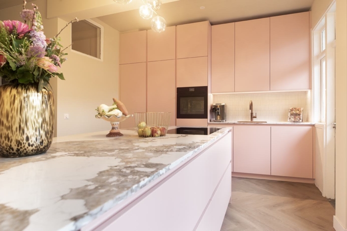 Zachtroze keuken met marmerlook werkblad